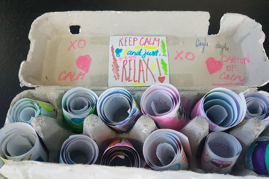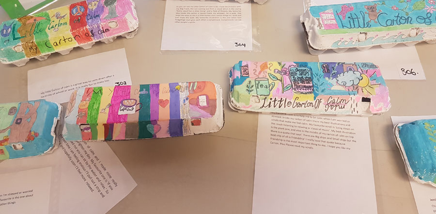 Description: The carton of calm was designed to provide children with an opportunity to explore and document what activities they could do to help them feel more calm. They decorated their egg cartons with an image that meant something to them personally. Then using the 12 spaces in their egg carton they wrote out 12 scenarios or ideas on how they might keep calm (e.g. I would lie on my bed and read a book). These were recorded on a piece of paper and rolled up to fit inside each space in the egg carton.