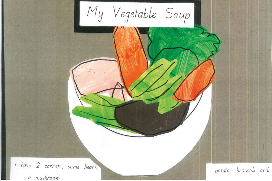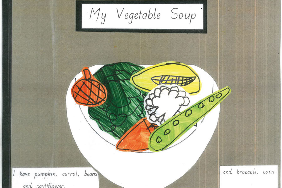 Description: During winter term, kinders participated in an extended outdoor class learning environment. This included healthy cooking, eg. weekly vegetable hearty soups, with students collaborating in the preparation of healthy meals to share. They were taught how to use equipment with competence and skill. Students made placemats showing their own selection of healthy vegetables for the soups. They sat together in a social setting, displaying traditional healthy table manners.