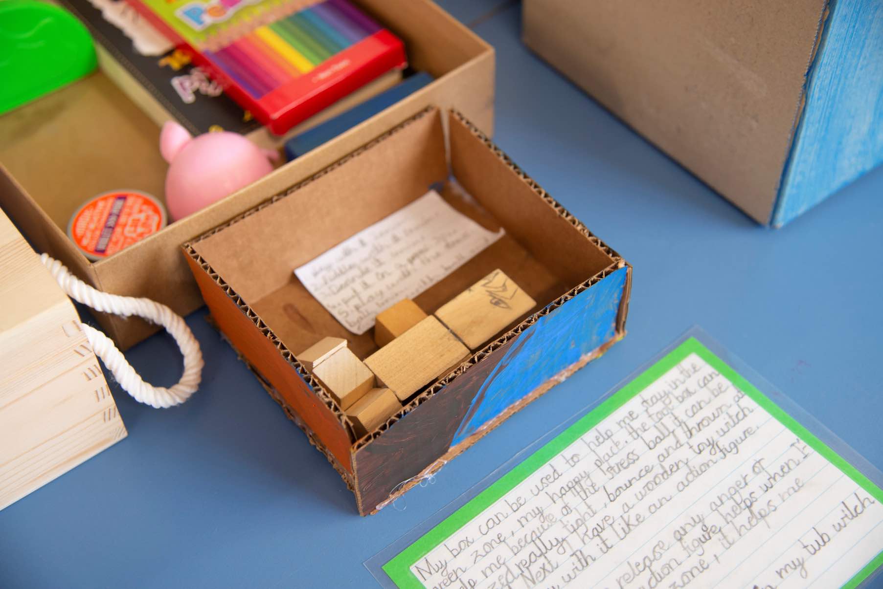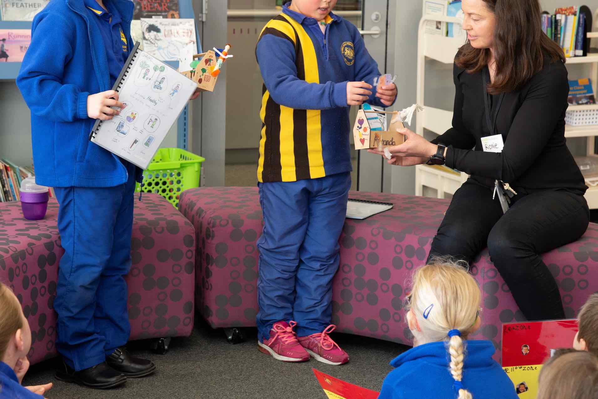 Description: Students across the whole school were invited to develop a toolbox of strategies. Teachers recognised an increase in their student’s fear and anxiety surrounding the COVID19 pandemic. Teachers encouraged their students during “lockdown” and upon return to school to explore a variety of techniques to manage the range of emotions they were experiencing during the pandemic. Teachers across the entire school planned this series of learning together. This was important to ensuring a whole of school approach. Despite not being physically connected at the time, it provided the children and their families with a common task and a shared language which could be shared across their school community. Each child created a toolbox (cardboard, wood, plastic, icy pole sticks, recycled products) which housed a variety of artefacts (keys to success, decorated touchstones, peg doll, mini Australian guide to healthy eating poster, COVID19 germs, flashcards with images/pictures that had personal meaning or a calming influence (e.g. image of the beach) which could be stored in their place of learning at home or on their desks at school. The children were encouraged to refer to the artefacts at different times of the day and in response to events that may create uncomfortable feelings of anxiety, uncertainty or fear. The students shared their insight with their peers, teachers, parents and other children (in other grades) across the school.