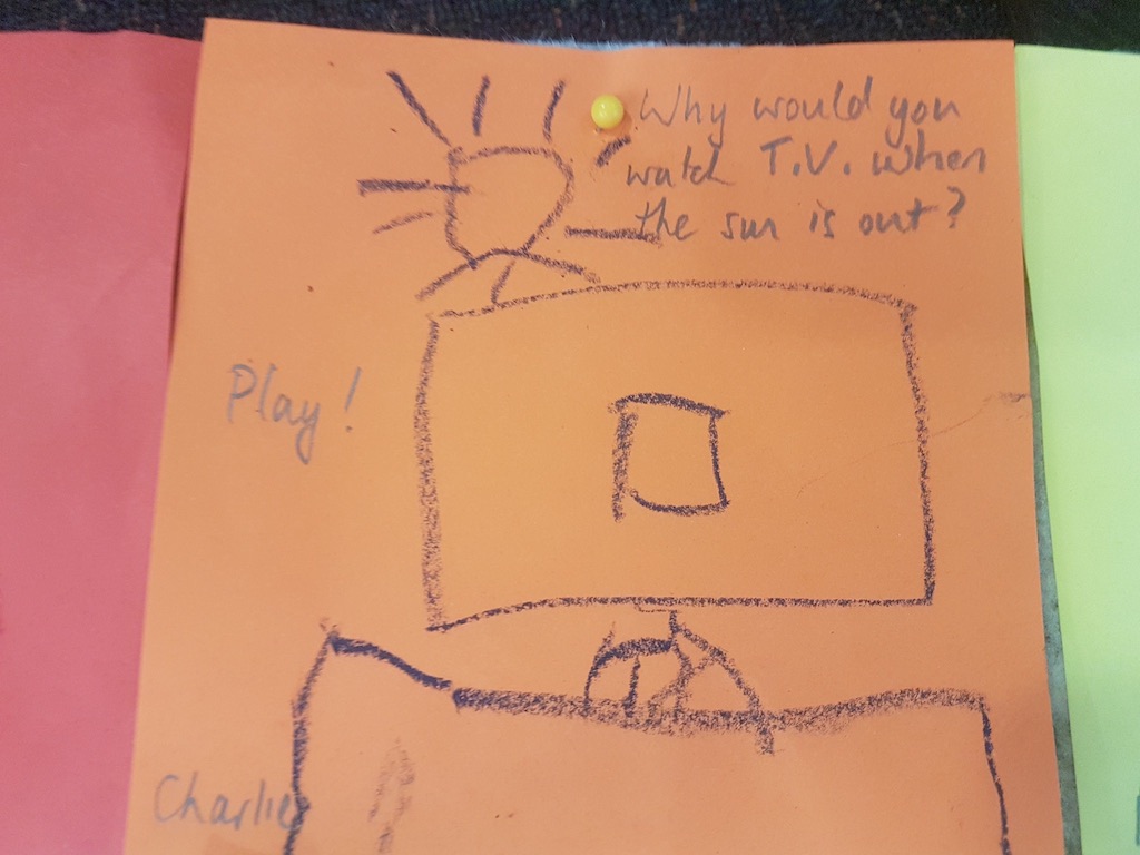 Description: Each child was encouraged to consider what helps them to grow and also what does not help them to grow. Each child would draw their response. Examples included: 1. Play! Why would you watch TV when the sun is out? 2.Too much sugar does not help us grow 3. no sun and pollution. The teacher or assistant teacher would invite each child to share their drawing with the class and describe what it represented. The teacher/teaching assistant would then add the information to their drawing. The individual artefacts/pictures were then displayed together as a group artefact to be shared on the wall in the classroom. This became a conversation point for the class, visiting students (from other classes), parents and other members of the school community.